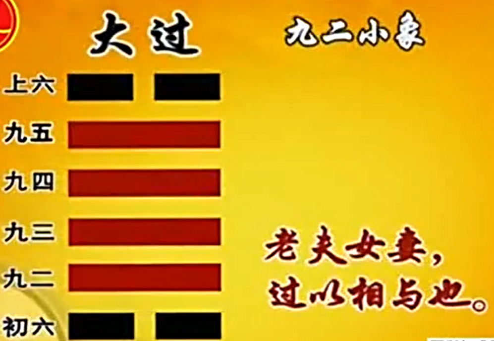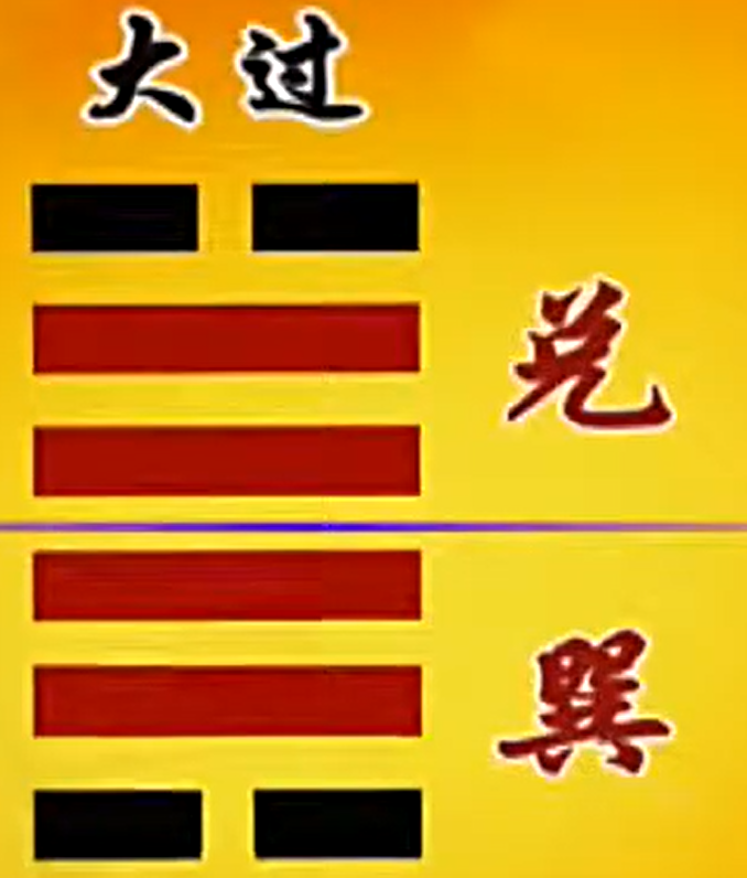 我们一般人都知道,学校里面,把那些行为不正当的学生,[给他大过的处罚(處罰) (chǔfá) (cyu5 fat6) give him a serious punishment]。所以这种印象,让我们一听到大过, 就会觉得很紧张,“哎呀!不好!” [其实不见得 in fact, not necessarily]。 大过的意思就是太过分了 the meaning of da-guo is too much。 你看我们在社会上,经常听到有人说,“太过分了!” 可是太过分了一定不好吗?不见得。 有时候刚刚开始我们认为太过分了,后来会让我们感觉到[简直太伟大了 it's just so great], 它当中会有个变化。所以大过这个卦,我们真的要好好来认识认识。