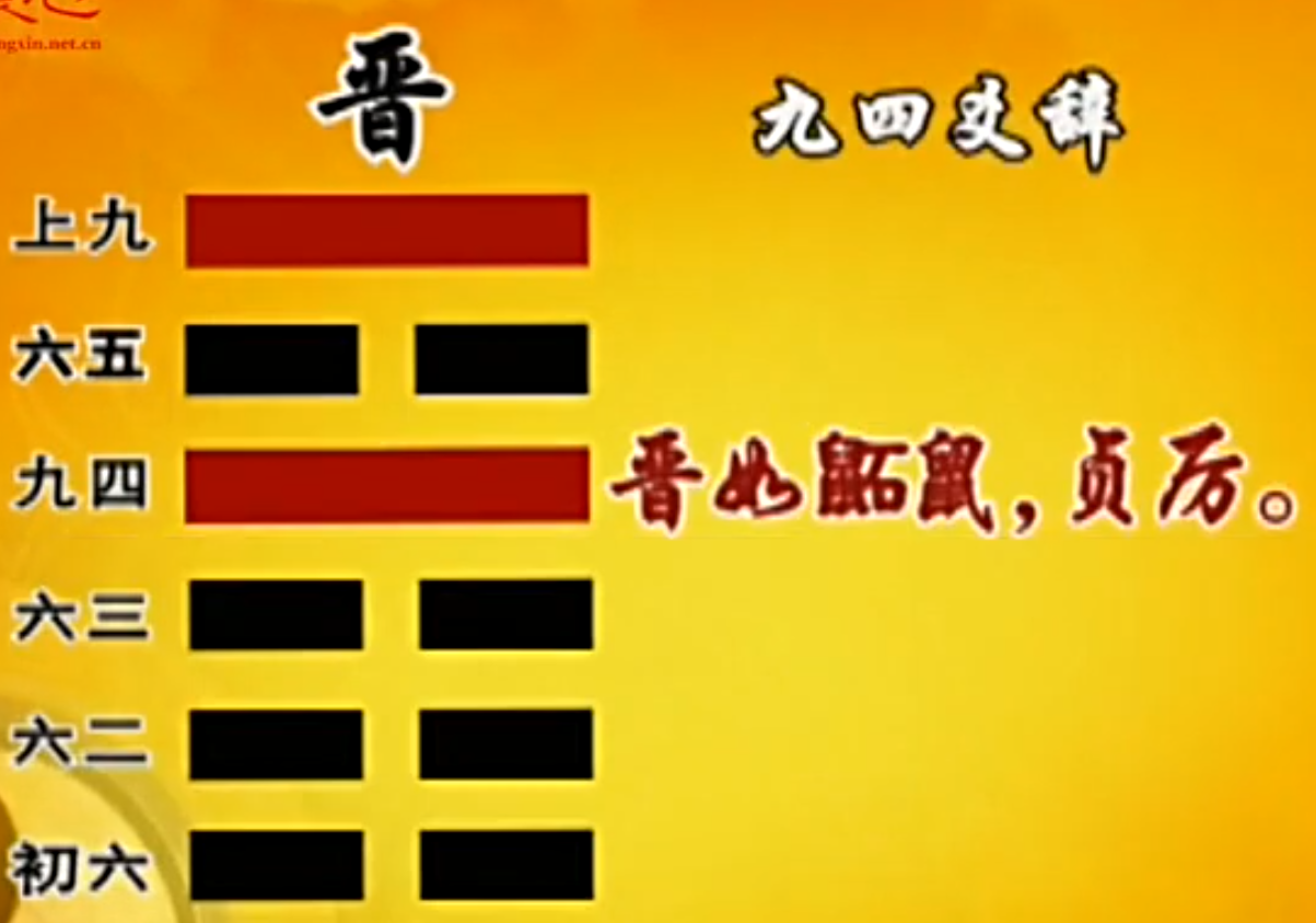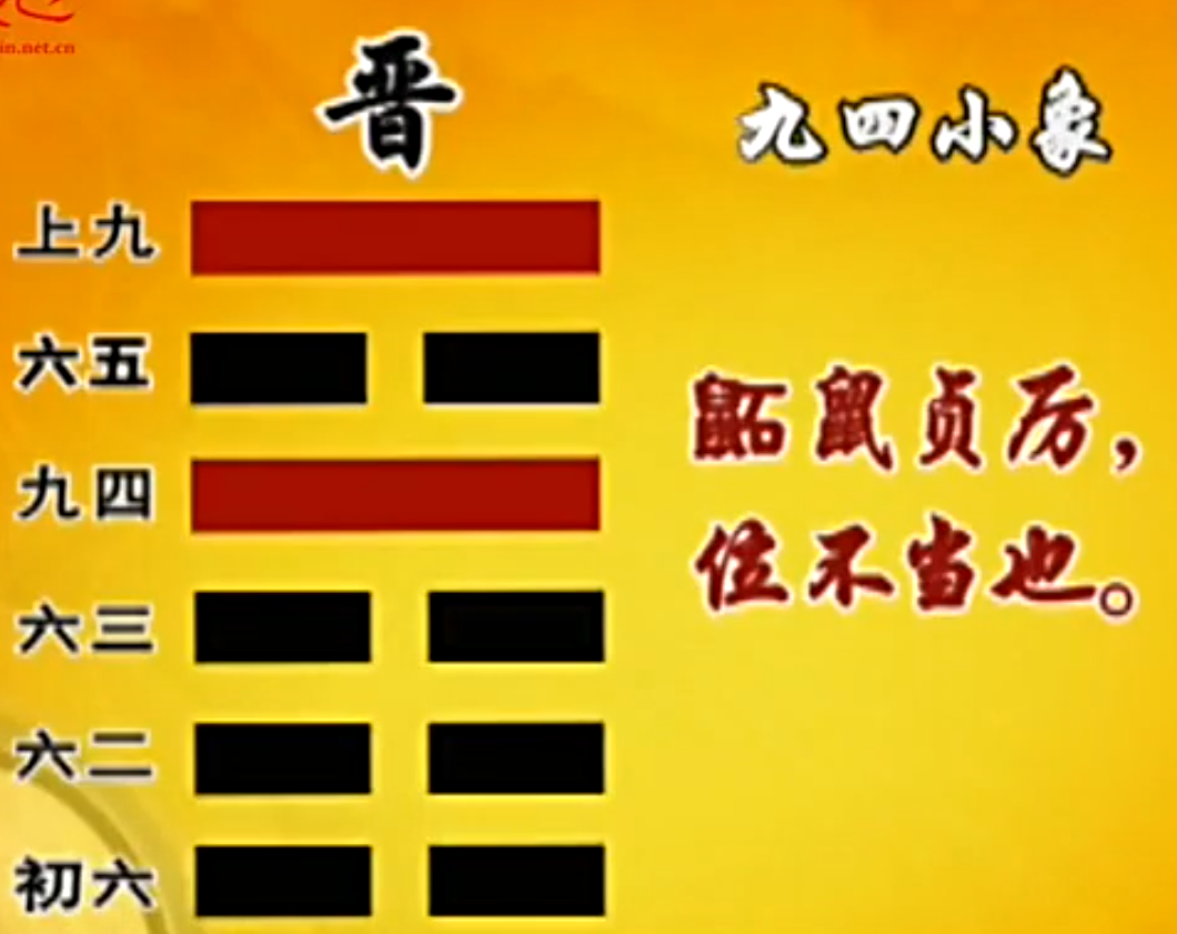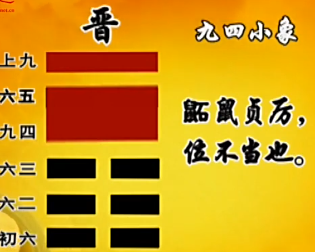 九四它柔弱,因为它是柔位,它是阴位,可是你又装得很刚强,你要去做那种挑重担的行为, 这就好像你是鼫鼠一样的,贪恋权势,嫉妒贤才,贪得无厌,这种人, 贞厉。