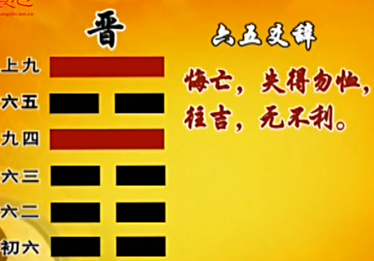 晋卦体现的是离上坤下,阳光普照大地的景象,然而现在晋卦的下卦三爻, 郁郁而不得志,而九四爻更是蠢春欲动。那么面对这样的情况,作为卦主的六五爻, 又应该采取怎样的做法,才能既不会影响到内部的和顺,又能够实现整体大局的持续发展呢?