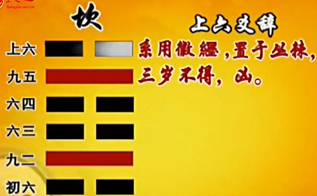(五) 坎卦的第六爻,位于全卦的最上面,[象征着 symbolizes]已经到水面了, 应该是可以脱险了,但是第六爻的爻却说(上六爻辞):三岁不得,凶。 象辞也说:上六失道,凶三岁也。 这是为什么呢?[为什么即将脱险之际 (jì) (zai3) why, just as you were about to escape danger / pourquoi, alors que le danger était sur le point d'être écarté],却暗藏着极大的凶险呢?