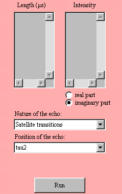 Then, we select the nature of the echo and its position with the two choice boxes above the RUN button. Since the echoes are detected in the two channels in quadrature of the receiver, after pressing the RUN button we use the check buttons to choose the real or the imaginary parts of the echo amplitude.