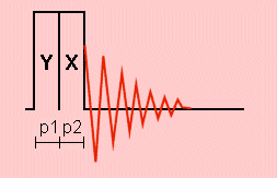The following applet is initialized for the central-line intensity of a spin I = 3/2 in a powder excited by the basic Y-X spin-locking sequence where p1 and p2 vary simultaneously from 0 to 10 µs by 0.5 µs step. The experimental line intensities are identical to the simulated ones.