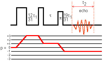 Shifting the echo by a time tau ensures the collection of the whole echo during the acquisition time and its appearance at a fixed position in the t2 time domain. The third pulse is a selective pi pulse for the central transition.